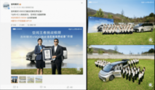 11月25日,也即在吉利銀河V900增程MPV即將上市的前夕,吉利銀河在官方微博發布42名女性舞者同時進入車內的視頻,視頻中獲得吉尼斯世界紀錄官方認證并現場發獎。