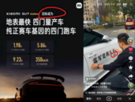 小米汽車被車主、自媒體各種玩梗:一會兒“xx AI營銷機”高仿雷軍話術將普通口罩包裝成高科技產品,一會兒車主在車身上貼“xx你是我兒子的偶像”仿小字免責。