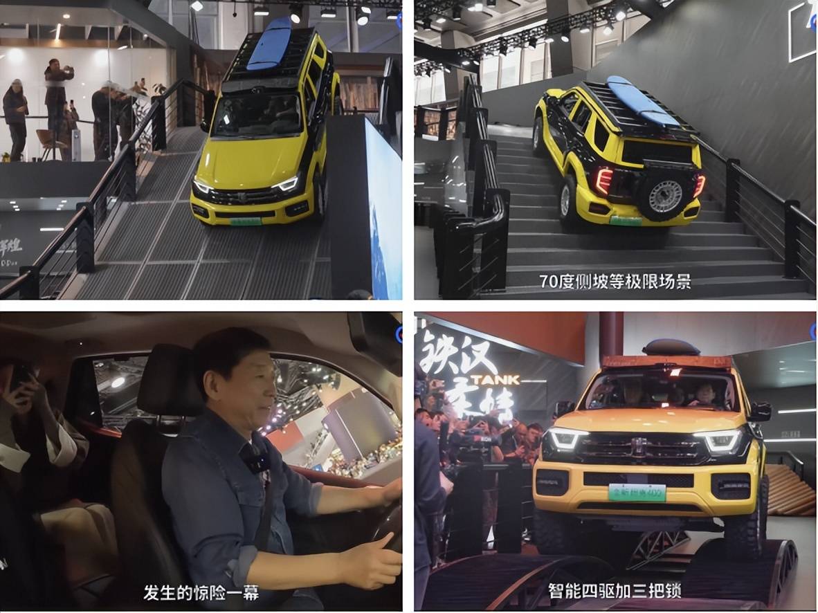11月24日廣州長城展位上,魏建軍駕駛黃色坦克 400 完成了爬坡、轉彎、炮彈坑穿越、連續駝峰路行駛、70° 側坡行駛等多項極限場景挑戰。他還以司機的身份,帶著新婚夫妻、自媒體嘉賓等粉絲體驗 A字坡、交叉軸等復雜路況,
