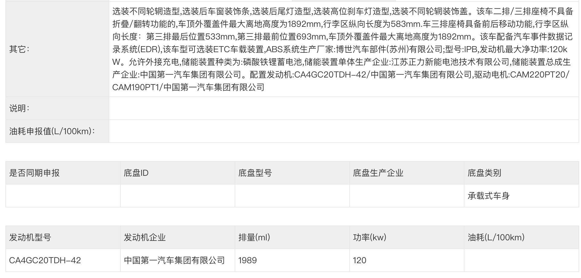 動力部分,2.0T發動機的代號為CA4GC20TDH-42,與現款CA4GC20TDH-40稍有不同。驅動方式部分,在雙電機車型之外,可見一款單電機版本,應該是新增了兩驅配置,現款全系四驅。電池部分,變為江蘇正力的磷酸鐵鋰電池。