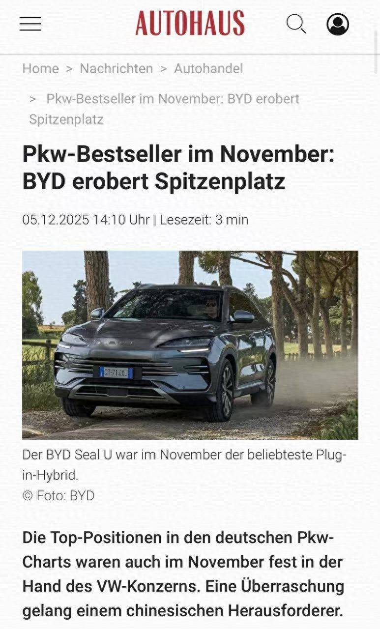 近日,BYD SEAL U(宋PLUS)成為德國11月車市插混車型銷量冠軍,引發行業廣泛關注。這不僅是中國汽車品牌首次在德國主流細分市場登頂,更意味著比亞迪在歐洲的發展規模已進一步提升。