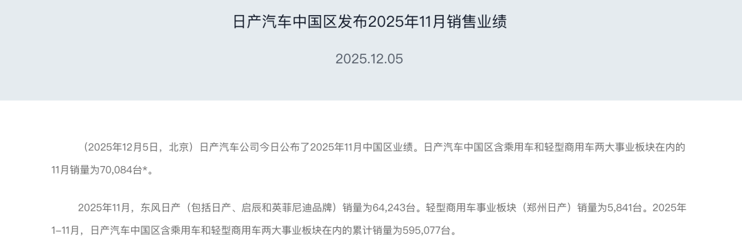 【東風】(包括日產、啟辰和英菲尼迪品牌)11月銷量為64243臺,同比、環比雙增長。其中,日產品牌銷量為62300臺,同比增長13.2%。11月交付超3.8萬臺,創下2025年月度銷量新高。此外,輕型商用車事業板塊(鄭州日產)11月銷量為5841臺。