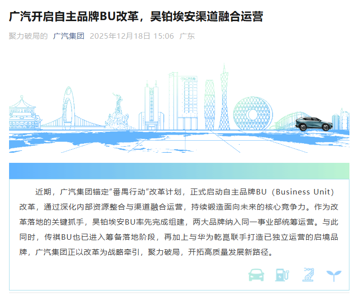 12月18日,廣汽集團(tuán)正式宣布,錨定“番禺行動(dòng)”改革計(jì)劃,集團(tuán)近日啟動(dòng)了自主品牌BU(Business Unit)改革,通過(guò)深化內(nèi)部資源整合與渠道融合運(yùn)營(yíng)。