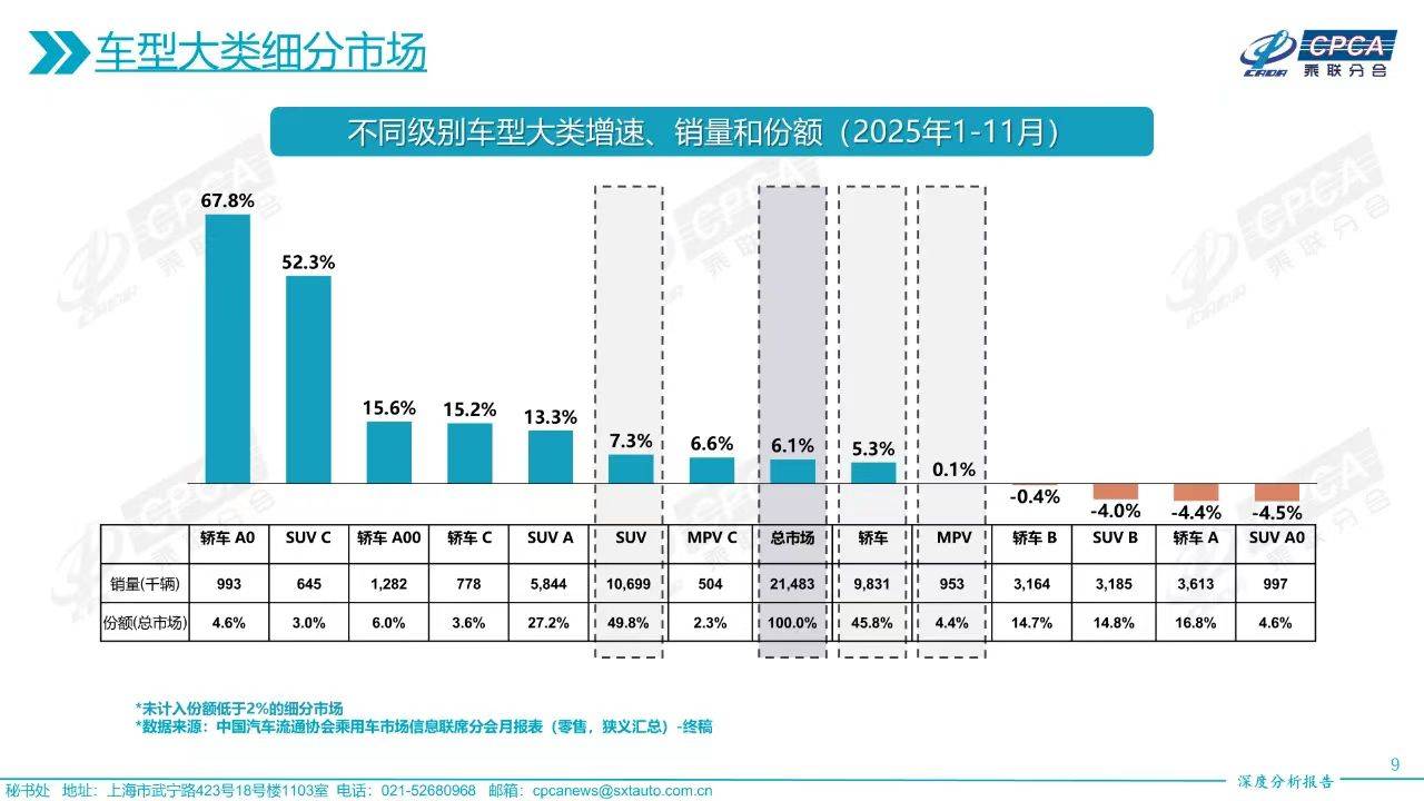同時,中大型SUV的整體表現也較為搶眼,1-11月中大型SUV零售量64.5萬輛,同比增長52.3%,僅次于小型車67.8%的增速。對比來看,中大型SUV和小型車的增速都遠超其他細分市場。