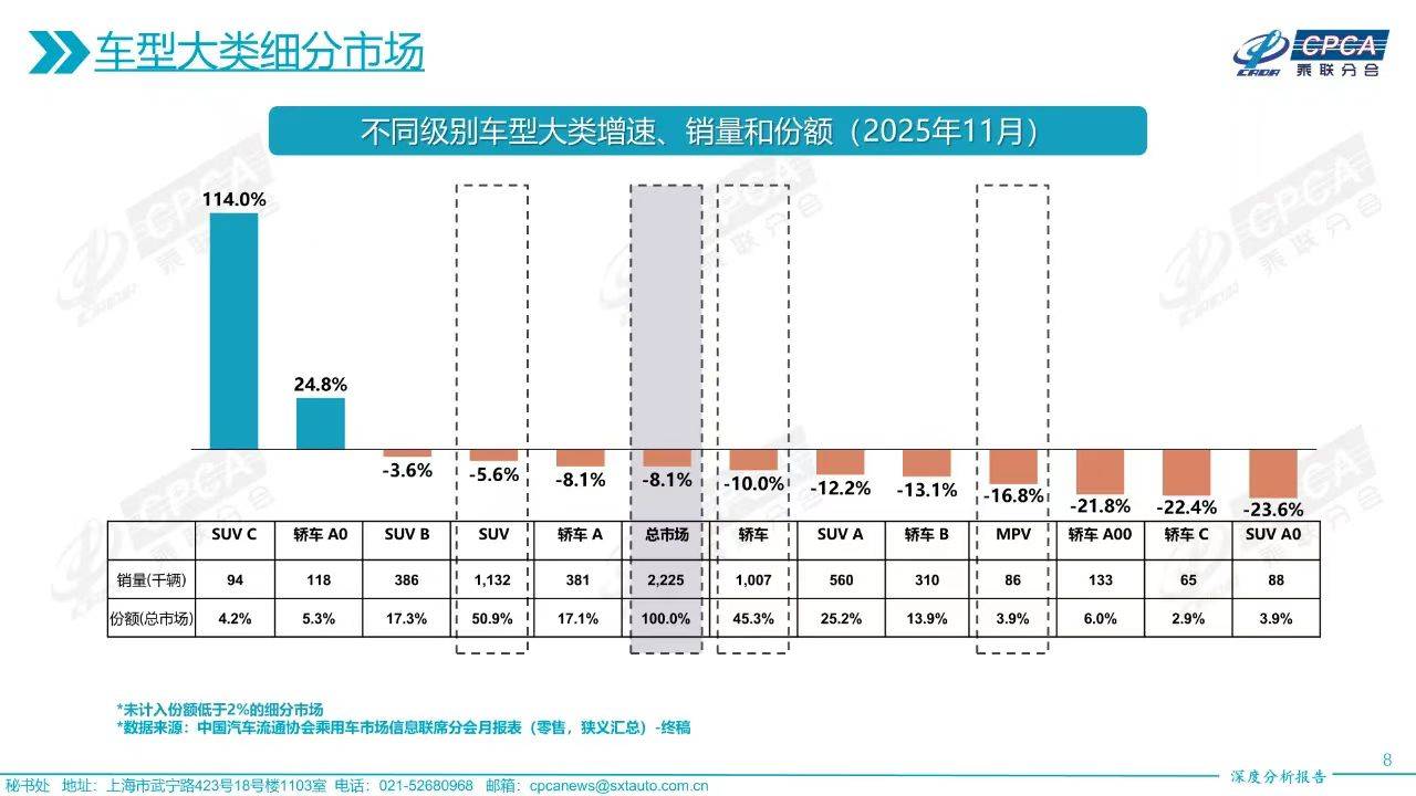 汽車零售市場下滑,但中大型SUV市場逆勢上揚,成唯一實現翻倍增長的細分市場。11月,中大型SUV零售9.4萬輛,同比增長114%,占總市場份額4.2%。