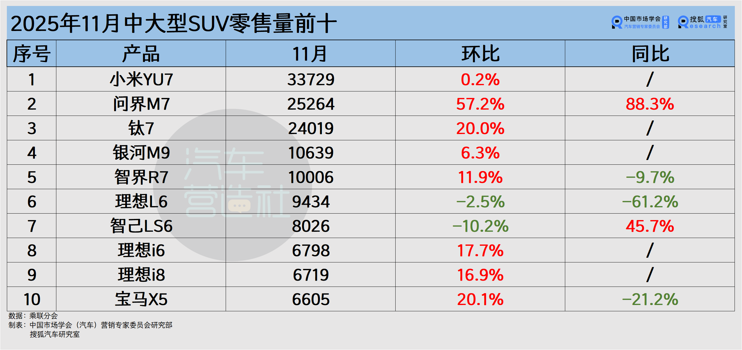 11月中大型SUV零售榜單呈現“全電化”特征,前九名均為自主新能源車型,傳統燃油車僅剩寶馬X5躋身前十。