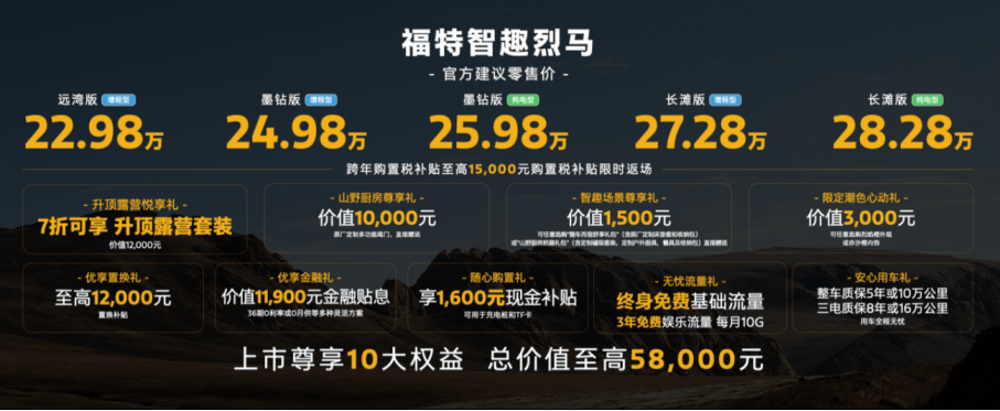 與價格同步公布的“十大尊享權(quán)益”,總價值高達(dá)5.8萬元,展現(xiàn)出福特對開拓這一細(xì)分市場的決心。權(quán)益包不僅涵蓋金融貼息、置換補(bǔ)貼等常規(guī)購車優(yōu)惠,更創(chuàng)新性地將“升頂露營”、“山野廚房”等特色配置以優(yōu)惠禮包形式提供給用戶,并承諾終身免費(fèi)基礎(chǔ)流量及長周期質(zhì)保,旨在降低用戶的“全生命周期擁有成本”。