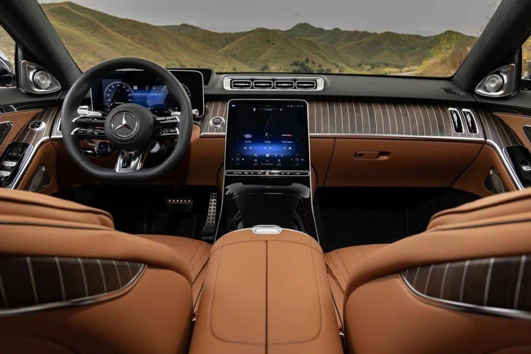 S63 AMG EP采用Nappa真皮座椅、碳纖維飾板、翻毛皮材質(zhì),搭配紅色縫線及AMG標(biāo)識(shí),支持紅黑撞色設(shè)計(jì)。雙液晶屏、AMG專屬駕駛模式選擇界面,支持語音控制與多屏聯(lián)動(dòng)。標(biāo)配空氣懸架,支持車身高度調(diào)節(jié)與自適應(yīng)阻尼調(diào)校,兼顧操控與舒適。