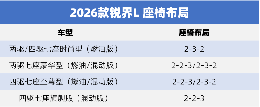 作為多口家庭,我會重點關注車輛的空間。2026款銳界L是真的大,5米車長,接近3米軸距。據(jù)我了解,這款車有2-2-3/2-3-2布局可以選,實際上不同的車型也有差異。我也做了一個表,大家可以看看。