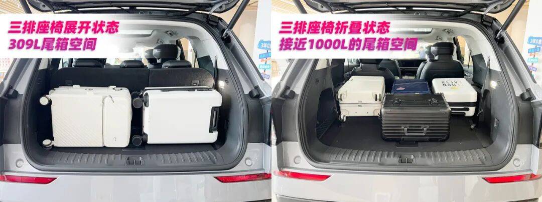 在七座滿員的情況下,后備箱的空間也是很大,數(shù)據(jù)可以達到309L。大家如果要買年貨,可以把第三排座椅放倒,就擁有接近1000L的空間。如果你對空間有更大需求,選擇2-3-2座椅布局車型,第二排座椅還能折疊,空間接近3000L。