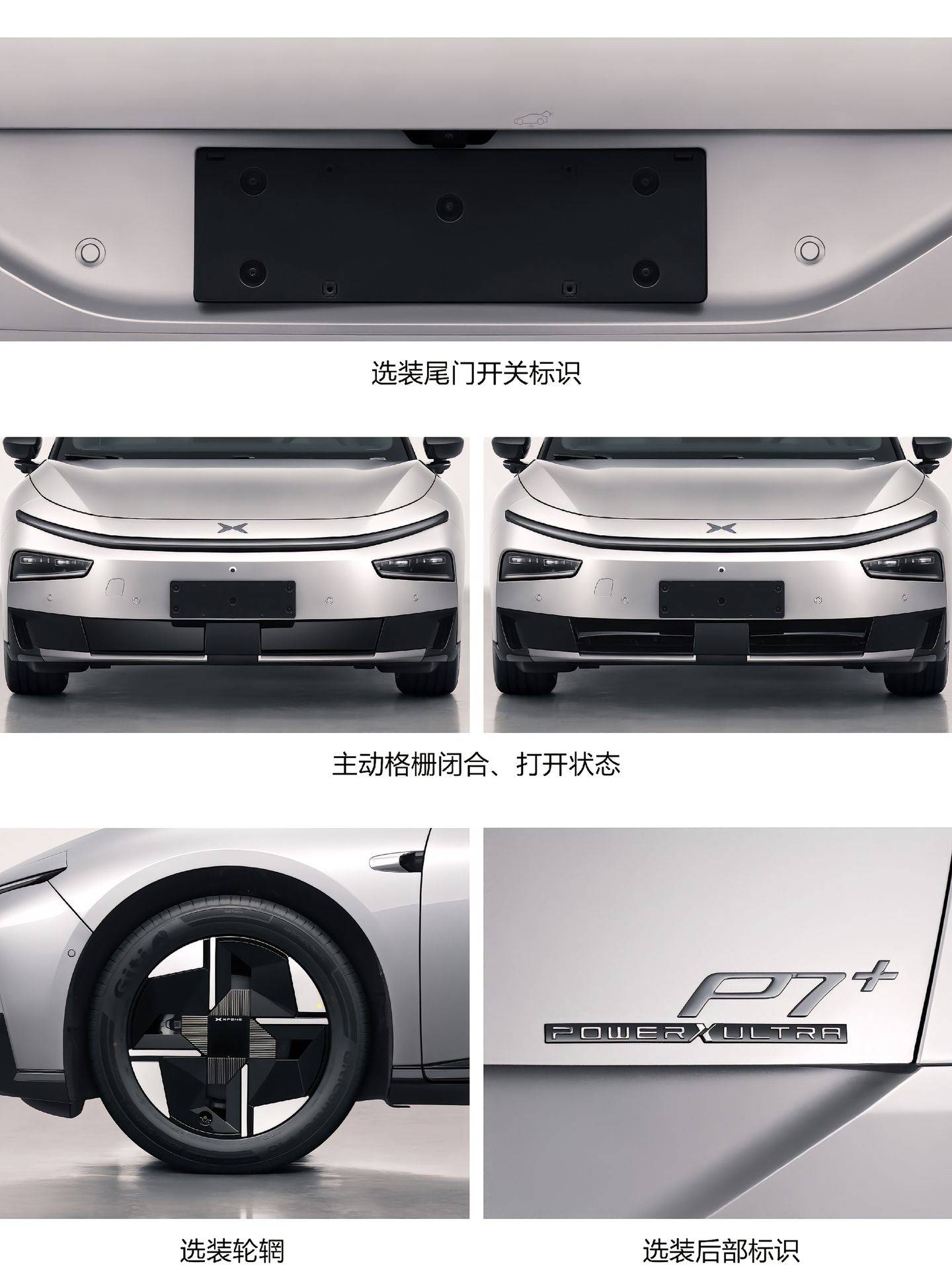 結合申報圖來看,26款小鵬P7+基本延續了現款車型的造型設計,不過前臉將換裝一體式無斷點星環燈帶,分體式大燈也沒有缺席,但遠近光燈組下方將取消熏黑飾條點綴,并針對前包圍進行重新設計,采用貫通式熏黑主動進氣格柵。同時還可以看到“POWER X ULTRA”尾標,也就意味著或搭載3顆圖靈AI芯片,算力達2250TOPS,可實現車位到車位泊車、城市/高速NGP等功能。