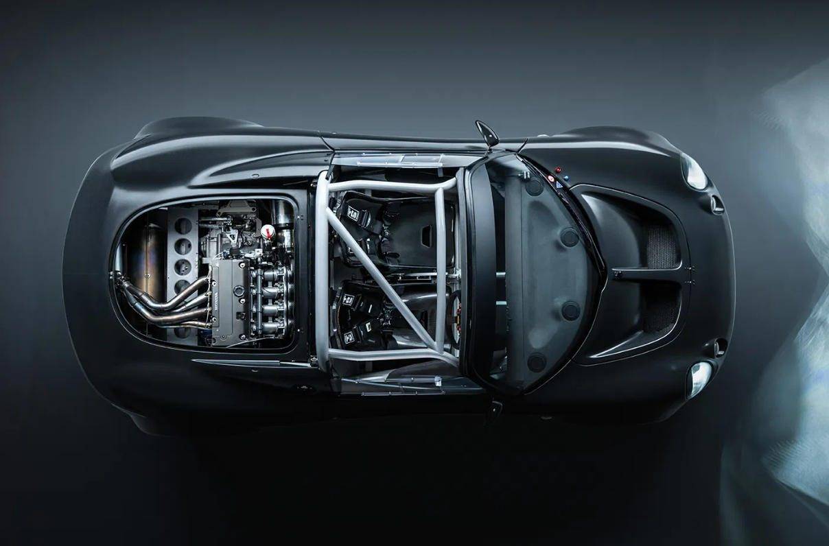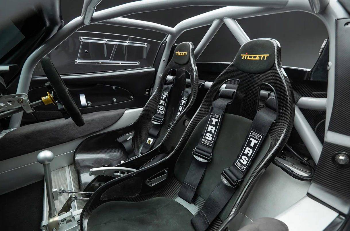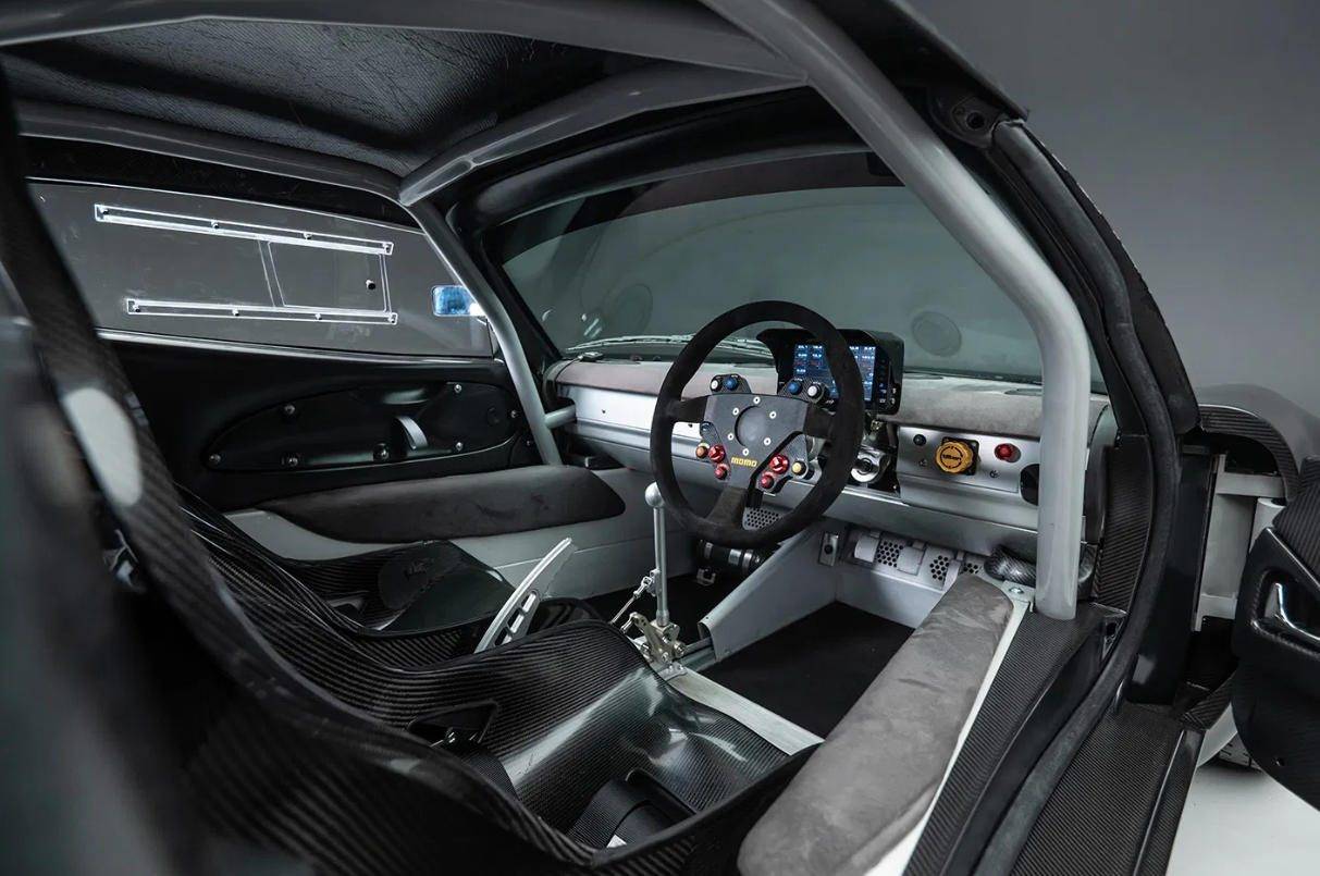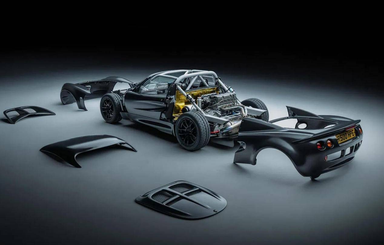 車架方面,保留蓮花擠壓鋁合金單體殼,但完全拆解、重新電鍍,其余80%以上部件全部重新設計。整車換裝全碳纖維車身,由復合材料廠烘焙成型,每個前后殼體重量僅為5kg,單手輕松提起來。車窗采用聚碳酸酯材料取代玻璃,內飾裝飾幾乎沒有,僅能看到Tillett賽車座椅、T45鋼制防滾架、滅火系統,沒有空調也沒有音響。