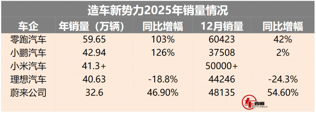 日前,隨著零跑、小米等車企先后公布12月份的銷量情況,頭部造車新勢(shì)力2025年銷量排名也隨之出爐:零跑以近60萬(wàn)的銷量奪得新勢(shì)力第一;小鵬超越小米,排在第二位。理想跌至第四,蔚來(lái)雖然墊底,但增幅可觀。下面,來(lái)具體看看吧。