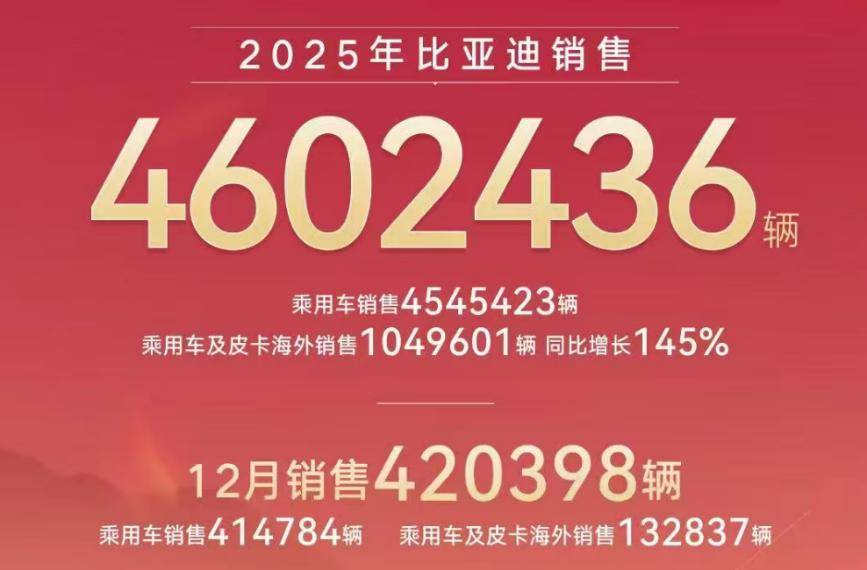 根據比亞迪公布的銷量數據,2025年12月單月銷售420398臺,全年累計銷量達4602436臺,在持續領跑全球新能源市場的同時也完成了年度銷量目標。