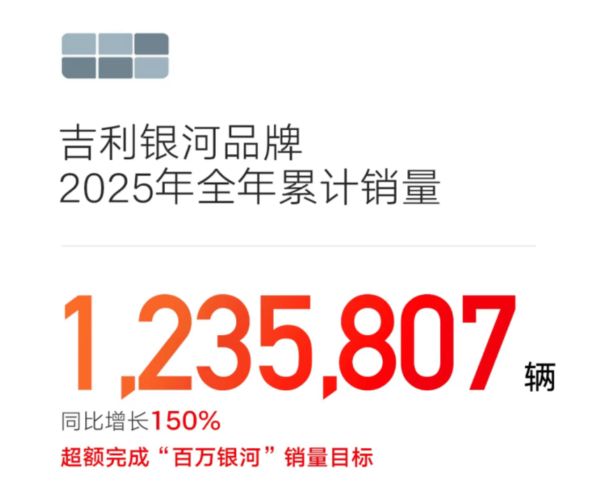 吉利銀河2025年全年累計銷量達1235807臺,同比增長150%,大幅超越百萬輛年度目標。