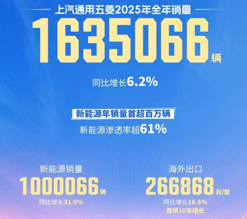 上汽通用五菱2025年全年整體銷量達1635066臺,同比增長6.2%。其中,新能源汽車銷量首次突破百萬輛大關,達1000066臺,同比大增31.9%。