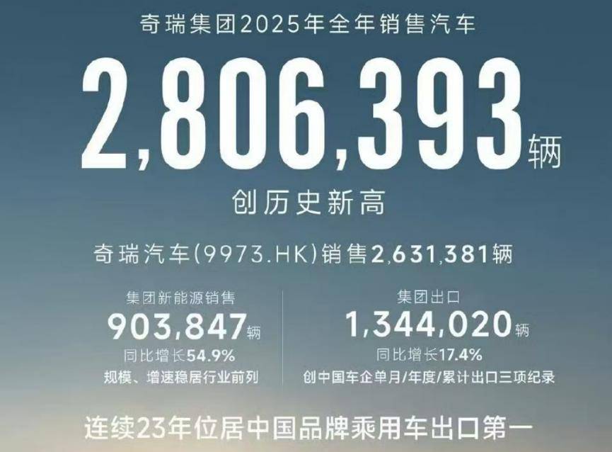 奇瑞集團2025年全年累計銷量達2806393臺,其中新能源銷量903847臺同比增長54.9%,這標志著其電動化轉型步入規模化新階段。另外,比較亮眼的是海外出口銷量,達到1344020輛同比增長17.4%,穩居中國汽車品牌出口第一。