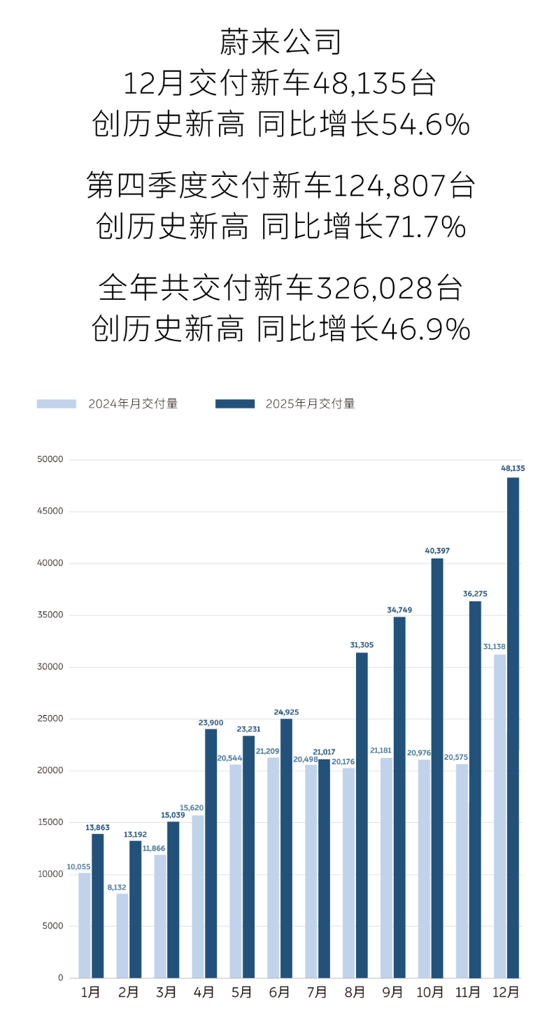 2025年蔚來公司全年累計交付326028臺,同比增長46.9%。主品牌蔚來穩健上行,12月交付31897臺,其中全新ES8交付新車22256臺,占到了銷量的近70%,成為名副其實的爆款。
