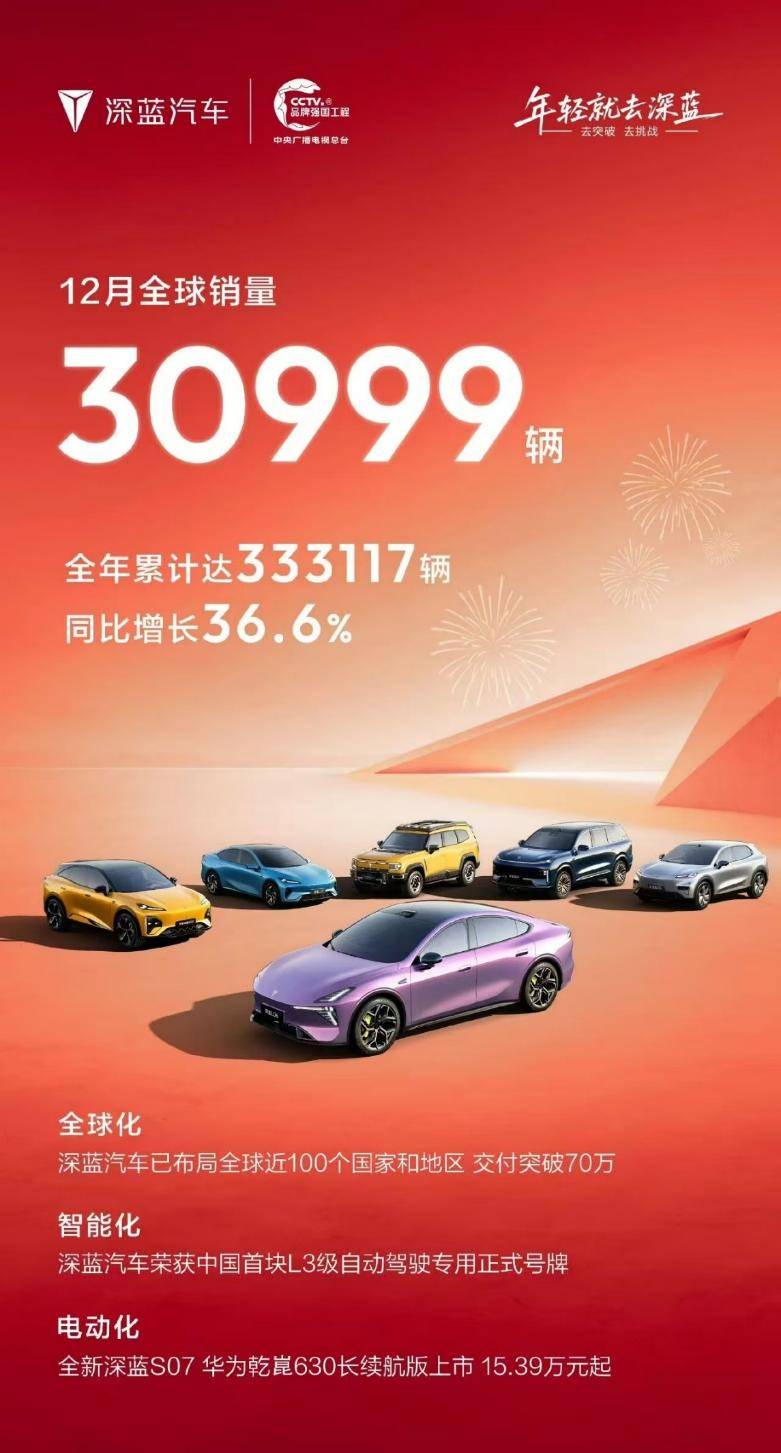 深藍汽車2025年全年全球銷量達333117臺,同比增長36.6%。12月單月銷量30999輛,延續了其穩定的市場表現。