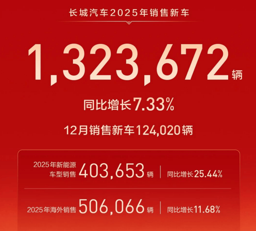 長城汽車全年累計銷量達到1323672臺,同比增長7.33%。其中,新能源車型銷售403653臺,同比增長25.44%,顯示出電動化轉型步伐持續加速。