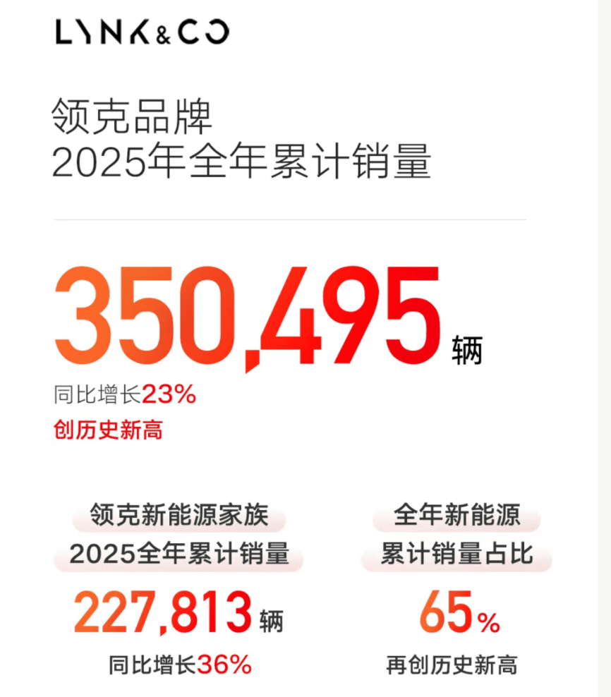 領克品牌全年累計銷量達到350495臺,其中新能源家族全年累計銷量227813臺,同比增長36%,同時,新能源銷量占比達到65%,創下新高。