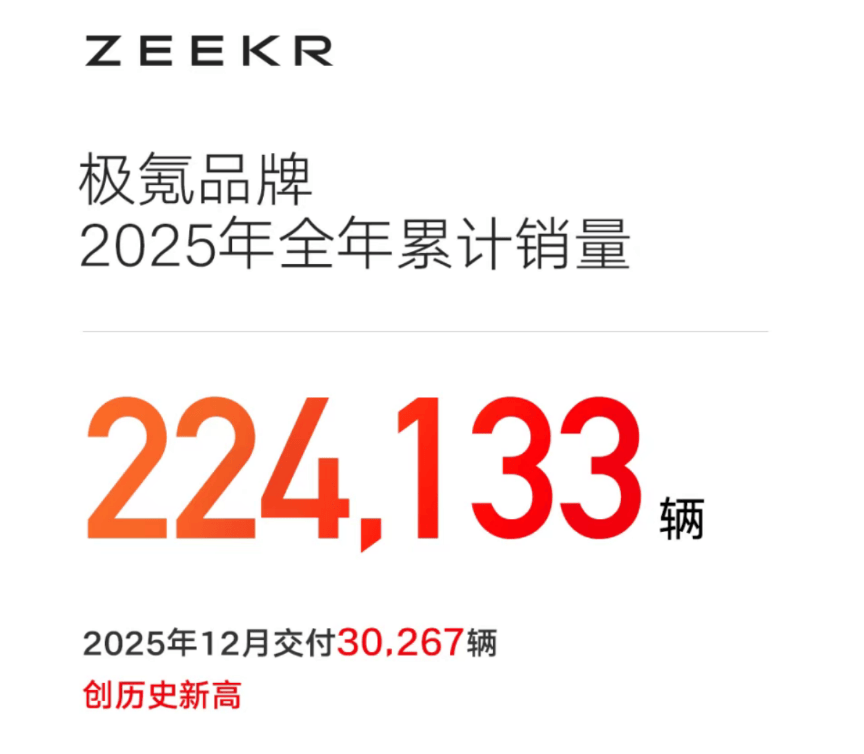 極氪汽車公布最新銷量,2025年12月交付新車30,267輛,同比增長11.3%,環比增長4.9%,連續多月保持穩健增長態勢。全年累計交付量成功突破22.4萬臺,在競爭激烈的高端純電市場進一步鞏固了地位。