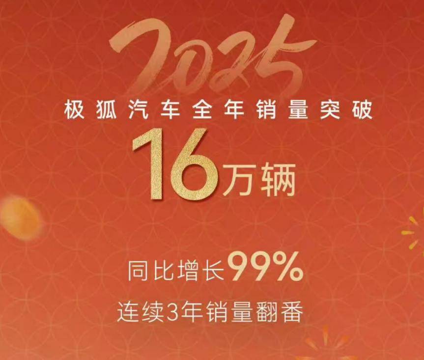 極狐汽車也完成了2025年的銷量沖刺。12月,其單月銷量達24,372輛,推動品牌全年銷量突破16萬輛大關,實現同比高達99%的快速增長。更值得注意的是,這已是極狐連續第三年實現銷量翻番。