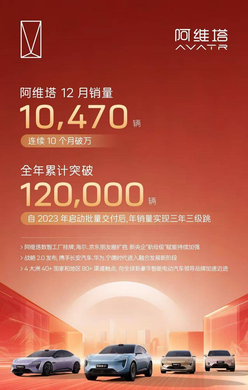 阿維塔科技以穩健姿態完成2025年收官。12月,阿維塔交付新車10470臺,這已是其連續第10個月銷量突破1萬臺,標志著品牌成功站穩主流高端智能電動車市場。2025年全年,其累計銷量也突破了12萬輛大關。
