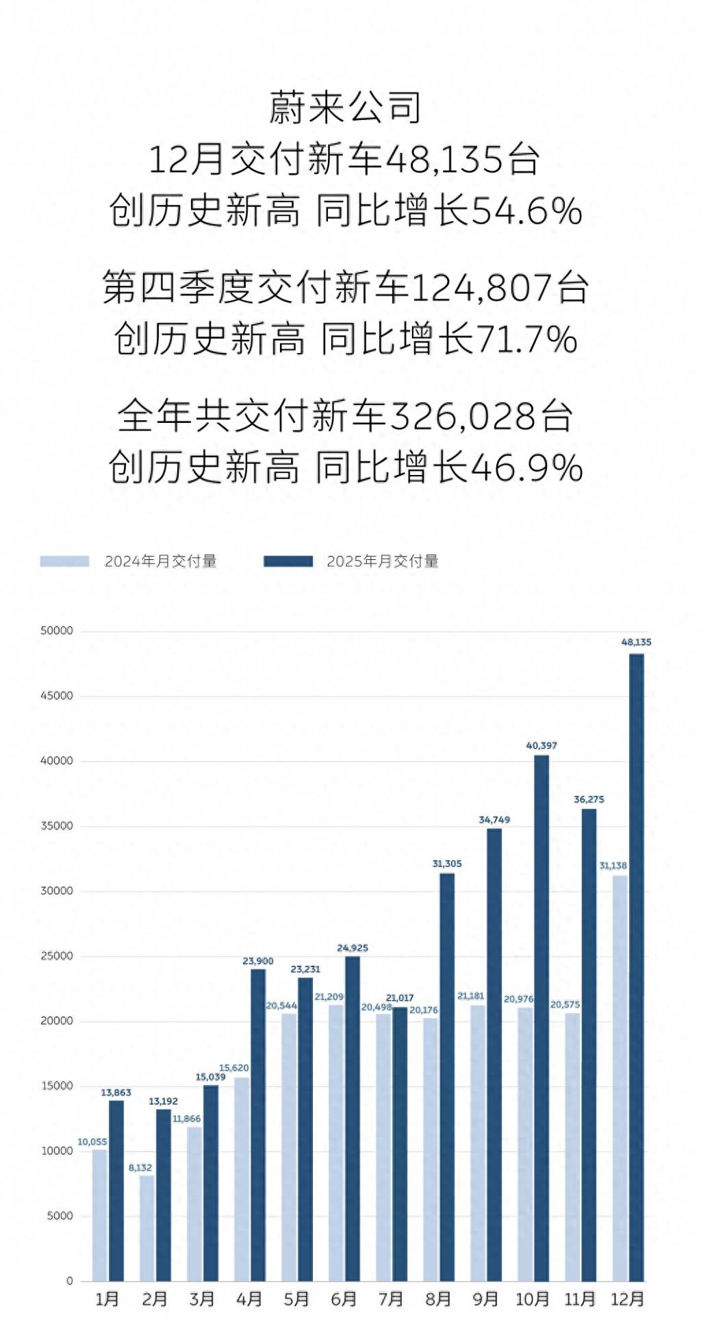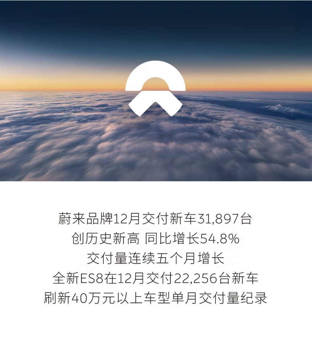 2025年12月,蔚來公司交付新車共計48135臺,創歷史新高,同比增長54.6%,全新ES8交付22256臺。