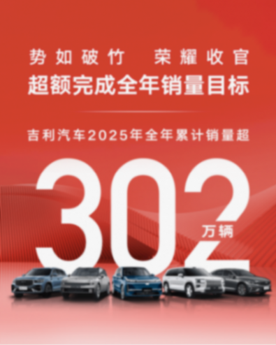 2025年,吉利汽車全年累計銷量3,024,567輛,同比增長39%,并且是超額完成300萬的銷量預設目標。