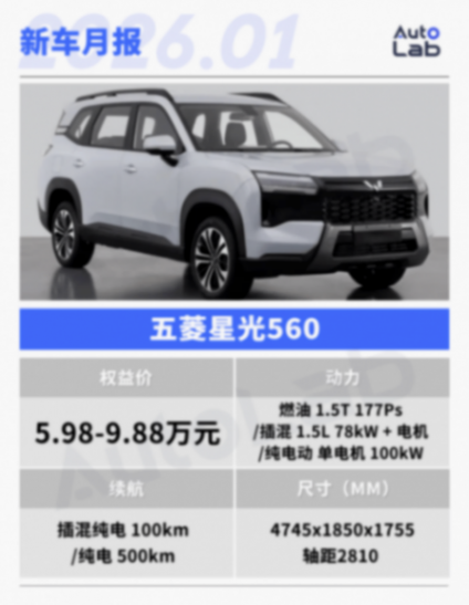 五菱星光560定位緊湊型SUV,整體采用偏硬派的風格設計,一口氣提供了燃油、純電、插混三種動力形式可選。