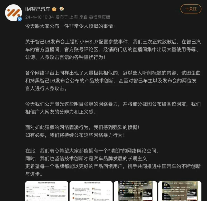 去年4月的智己L6發布會上,劉濤被指多次“碰瓷”小米汽車,并在PPT對比中錯標了友商參數,引發軒然大波。這場風波以智己發布聲明譴責“網絡暴力”告終,但品牌的公眾形象已然受損。