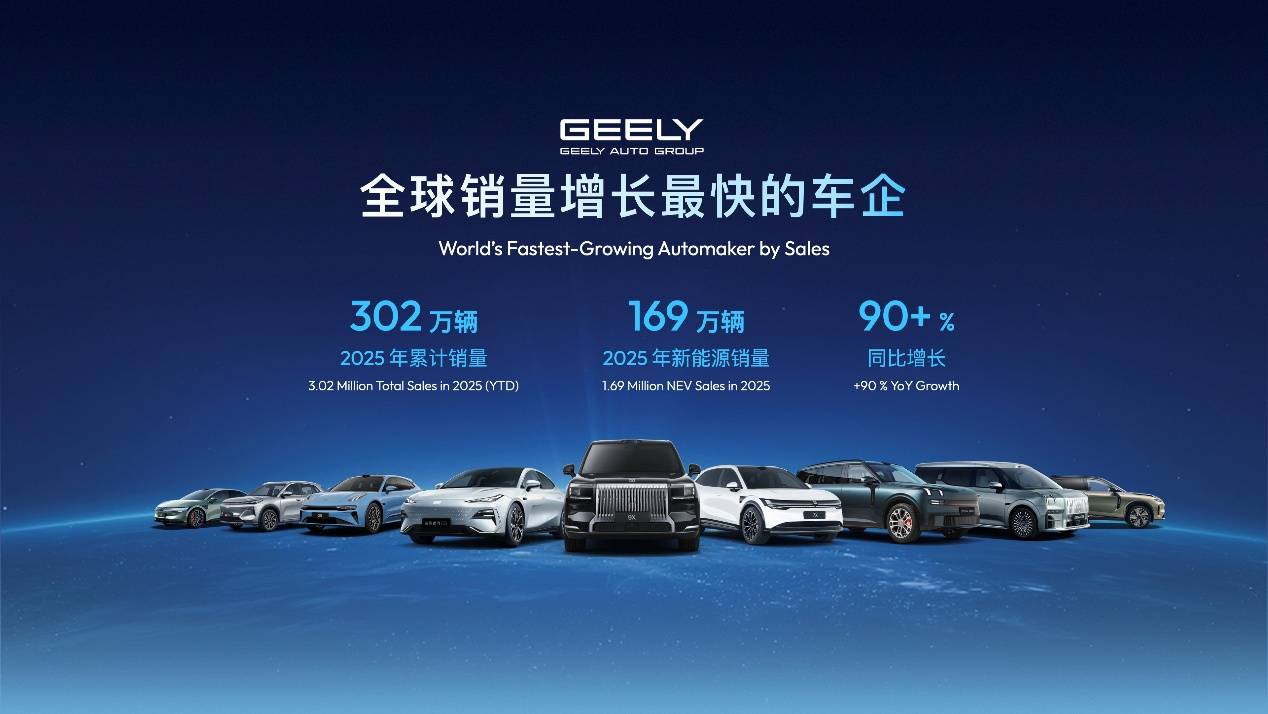市場數據證明,吉利的技術路線正在獲得積極反饋。2025年,在全域AI 1.0的賦能下,吉利汽車集團銷量突破302萬輛,其中新能源銷量近169萬輛,同比激增90%,創造了歷史佳績。