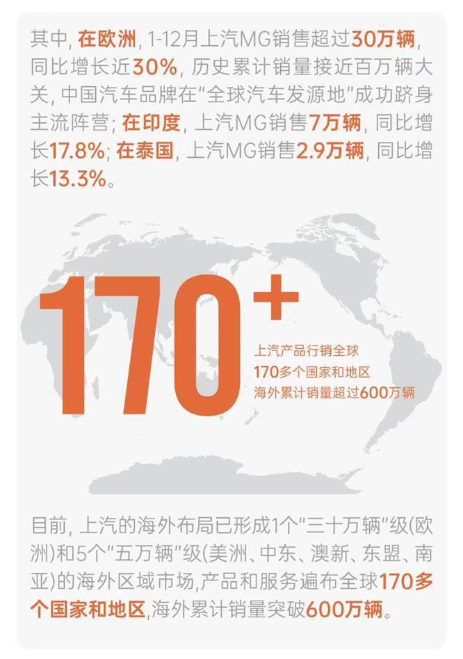 目前,上汽在海外市場(chǎng)已構(gòu)建起 “1+5” 全球化戰(zhàn)略版圖,以歐洲為代表的1個(gè)“三十萬輛”級(jí)為頭部市場(chǎng),以美洲、中東、澳新、東盟、南亞在內(nèi)的5個(gè)“五萬輛”級(jí)市場(chǎng)為主力市場(chǎng)的布局,上汽的產(chǎn)品和服務(wù)已遍布全球170多個(gè)國家和地區(qū),穩(wěn)步深耕海外市場(chǎng)。