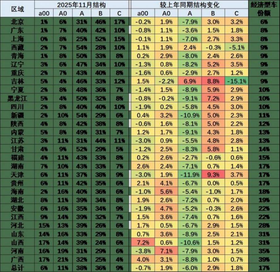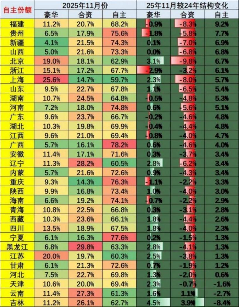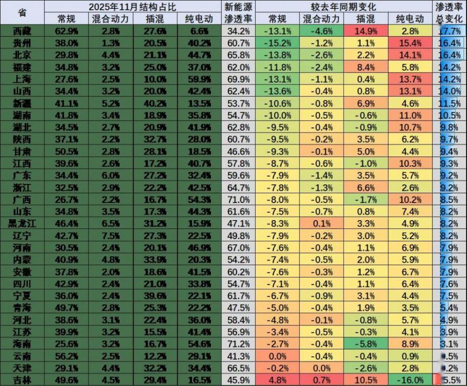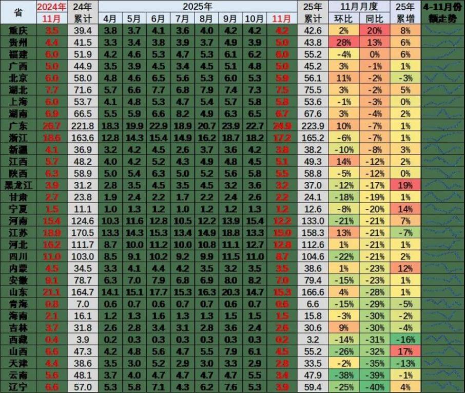 從11月各省銷量的具體增長來看,以北方的遼寧、天津、山西等地區車市表現相對較弱,重慶、貴州、福建等中西部地區表現也不錯,所以北方地區成為2025年增長表現最亮點的地區。