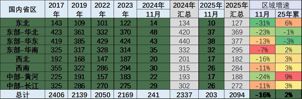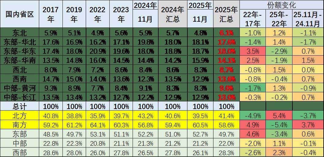 從過去幾年各地車市的發展狀態來看,“北強南弱”格局明顯。但北方車市2025年11月較上年同期的份額降3.7個百分點,2025年較2022年的北方份額增5.4個百分點。