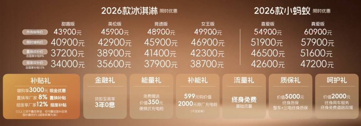 1月10日,奇瑞汽車旗下微型車——2026款奇瑞冰淇淋正式上市。新車共推出甜趣版、英倫版、競速版、女王版4款不同的外觀風格,指導價區間為4.39萬-4.99萬元,置換雙補價為3.72萬-4.23萬元,報廢雙補價為3.4萬-3.87萬元。采用2+2座椅布局,CLTC續航里程220km。