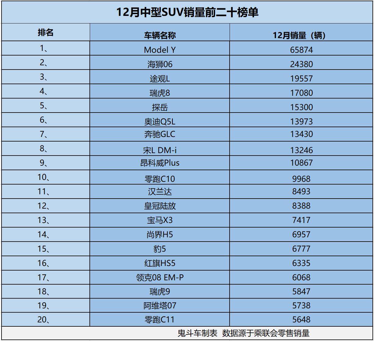 那么,哪些中型SUV更值得他們關注?不妨看看2025年12月中型SUV銷量榜單。為了讓網友們看得更清楚,鬼哥根據乘聯會零售銷量數據,整理出12月中型SUV排名前二十的銷量榜單。接下來,看看哪些車型賣得好?為消費者提供參考。