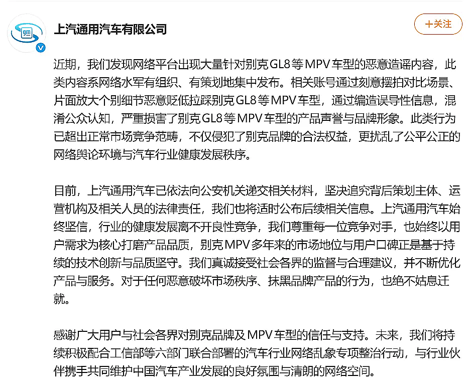 該司發(fā)現(xiàn)網(wǎng)絡(luò)平臺(tái)近期出現(xiàn)大量針對(duì)別克GL8等MPV車型的惡意造謠內(nèi)容,其認(rèn)為此類內(nèi)容系網(wǎng)絡(luò)水軍有組織、有策劃的集中發(fā)布。相關(guān)內(nèi)容通過刻意擺拍對(duì)比場(chǎng)景,片面放大個(gè)別細(xì)節(jié),以惡意貶損和拉踩別克GL8等MPV車型;存在編造誤導(dǎo)性信息以混淆公眾認(rèn)知的問題,嚴(yán)重?fù)p害了別克GL8等MPV車型的產(chǎn)品聲譽(yù)和品牌形象,其行為已經(jīng)超出正常市場(chǎng)競(jìng)爭(zhēng)的范疇。