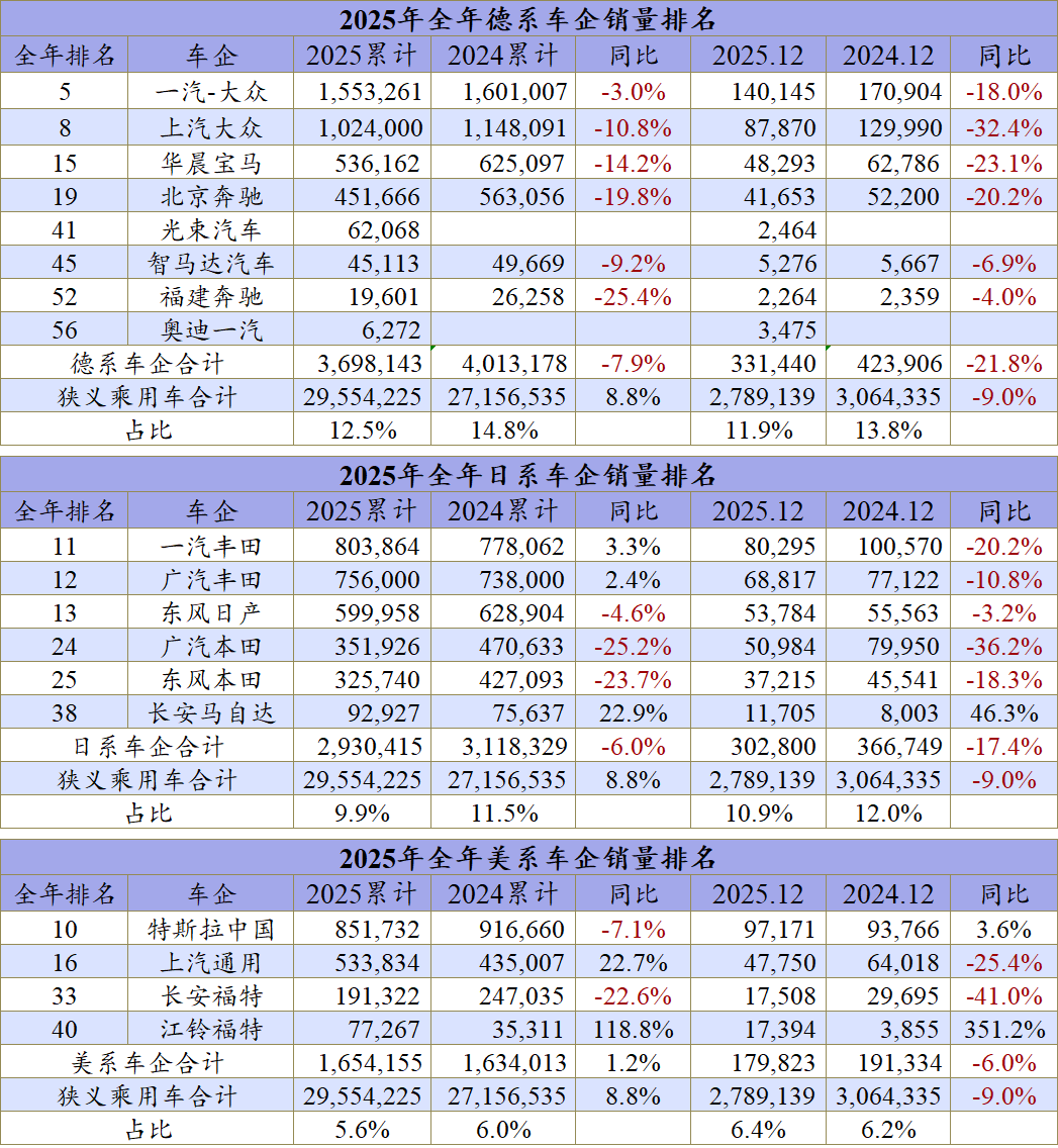 反觀合資陣營,集體陷入跌跌不休,新能源轉型滯后的弊端集中爆發。德系車企合計銷量369.8萬輛,同比下滑7.9%,份額從14.8%跌至12.5%,南北大眾、BBA無一幸免,其新能源滲透率遠低于行業平均水平。