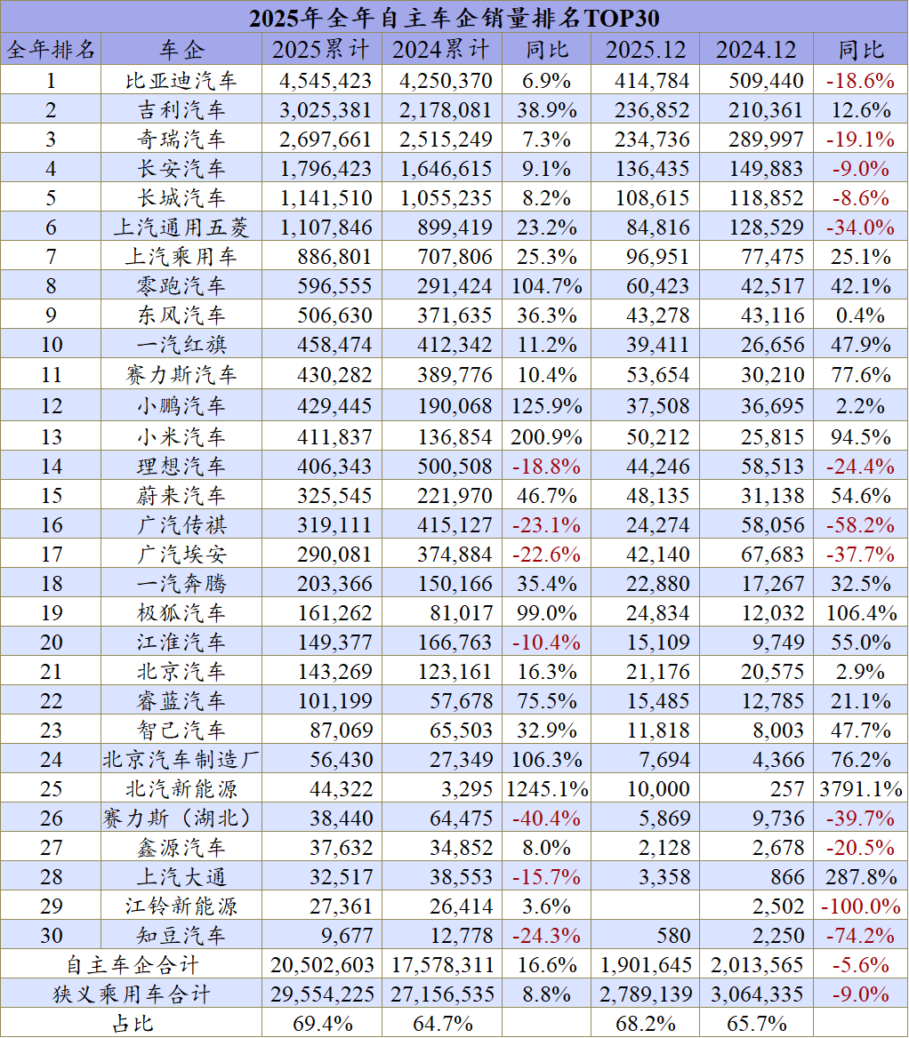 數據顯示,自主車企全年累計銷量2050.2萬輛,同比暴漲16.6%,市場份額從2024年的64.7%躍升至69.5%,距離70%僅一步之遙。這意味著中國市場每賣出10臺車,就有近7臺是自主品牌。