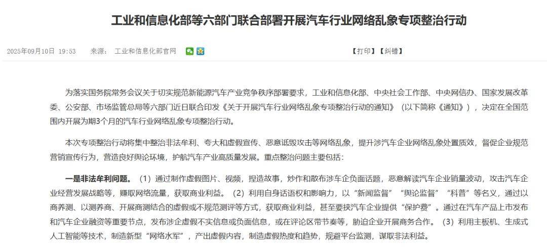 事實(shí):為落實(shí)國務(wù)院常務(wù)會(huì)議關(guān)于切實(shí)規(guī)范新能源汽車產(chǎn)業(yè)競爭秩序部署要求,工業(yè)和信息化部、中央社會(huì)工作部、中央網(wǎng)信辦、國家發(fā)展改革委、公安部、市場監(jiān)管總局等六部門9月聯(lián)合印發(fā)《關(guān)于開展汽車行業(yè)網(wǎng)絡(luò)亂象專項(xiàng)整治行動(dòng)的通知》(以下簡稱《通知》),決定在全國范圍內(nèi)開展為期3個(gè)月的汽車行業(yè)網(wǎng)絡(luò)亂象專項(xiàng)整治行動(dòng)。