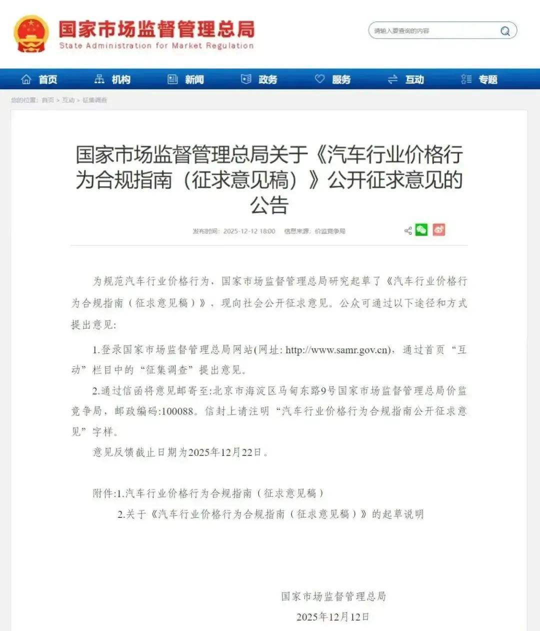 12月12日,國家市場監(jiān)督管理總局發(fā)布了《汽車行業(yè)價(jià)格行為合規(guī)指南(征求意見稿)》,指出企業(yè)要建立以生產(chǎn)成本為基礎(chǔ)、市場供求為導(dǎo)向的定價(jià)策略,汽車生產(chǎn)企業(yè)不得以排擠競爭對手或者獨(dú)占市場為目的,實(shí)施不正當(dāng)價(jià)格競爭行為。