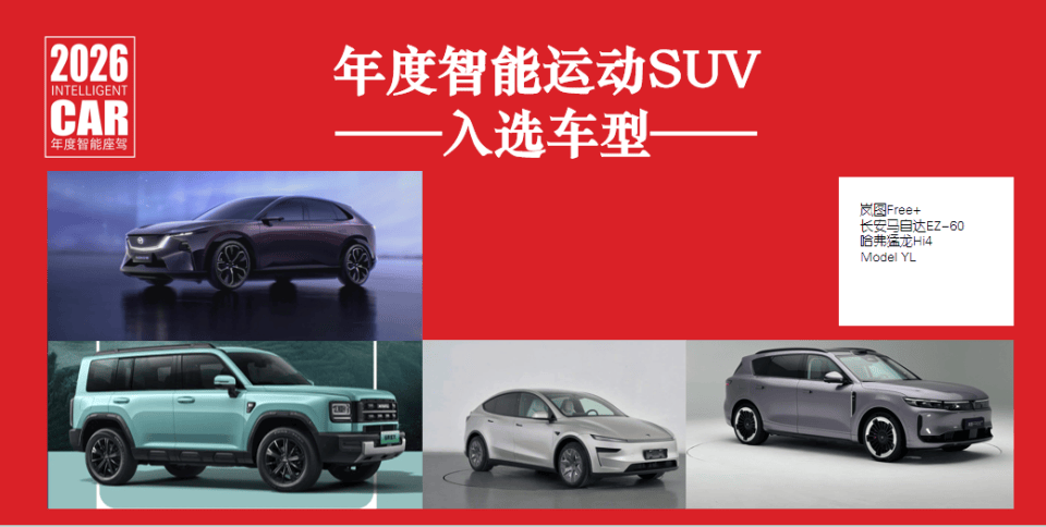 年度智能運動SUV有四款車型入圍:嵐圖Free+、長安馬自達EZ-60、哈弗猛龍Hi4、特斯拉Model YL。這是以智駕能力著稱的特斯拉入圍的唯一一款車型。