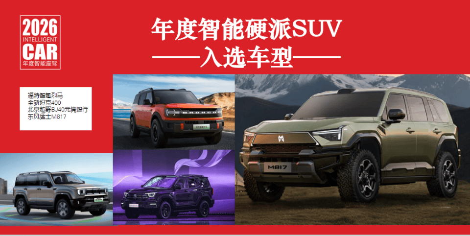 年度智能硬派SUV有四款車型入圍:福特智趣烈馬、全新坦克400、北京越野BJ40元境智行、東風猛士M817。硬派越野車擁抱高階智駕是2025年新上市的諸多硬派越野車型的一大特點。地今年的年度智能座駕的線下評測中,采用華為乾崑智駕ADS 4的東風猛士M817在70多公里的多場景路況中做到了零接管。