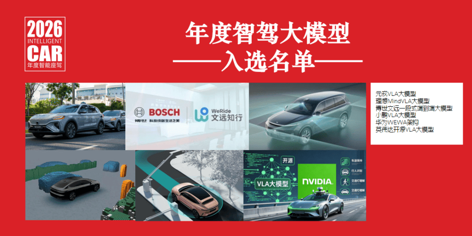 元戎VLA大模型、理想MindVLA大模型、博世文遠一段式端到端大模型、小鵬第二代VLA大模型、華為WEWA架構、英偉達開源VLA大模型。