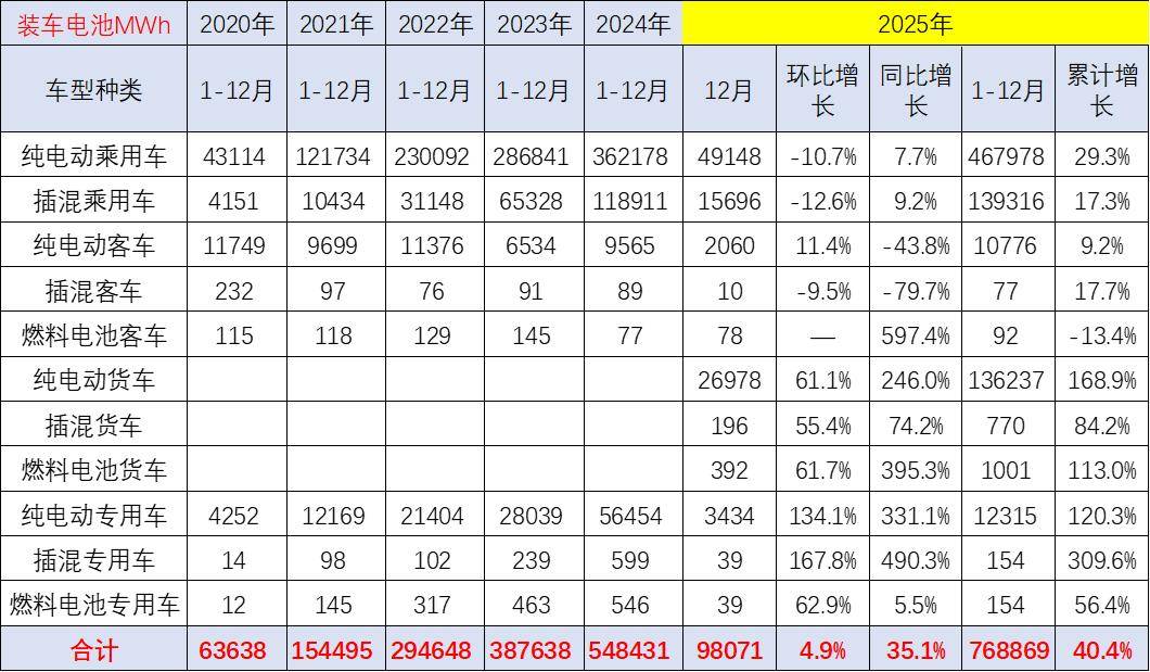 2025年12月的電池裝車增長達到35%,其中商用車增長較強,尤其是12月的純電動貨車猛漲246%,而插混貨車增長74%。