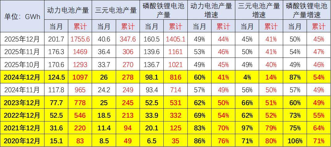 12月,我國動力和其它電池合計產量為202GWh,同比增長49%。1-12月,我國動力和其它電池累計產量為1756GWh,累計同比增長44%。