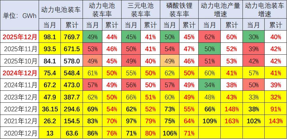12月,我國動力和其它電池合計產量為202GWh,同比增長49%。1-12月,我國動力和其它電池累計產量為1756GWh,累計同比增長44%。2025年動力電池的產量中裝車的比例保持到44%,其中三元電池裝車率41%,磷酸鐵鋰裝車率45%。2025年12月動力電池的產量中裝車的比例下降到49%,其中三元電池裝車率45%,磷酸鐵鋰裝車率50%,動力電池裝車景氣度達到年內低位。