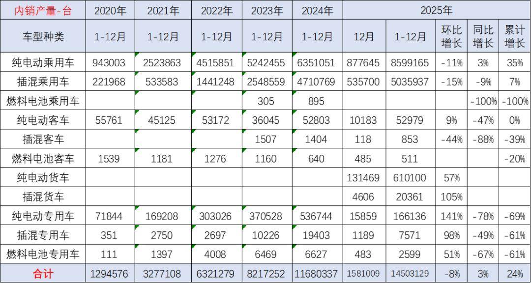 2025年1-12月新能源車國內合格證1450萬臺、同比增24%較強,其中純電動乘用860萬臺、同比增35%;插混乘用車503萬臺、同比增7%;純電動專用車和貨車78萬臺,這樣的產量數據表現很強。